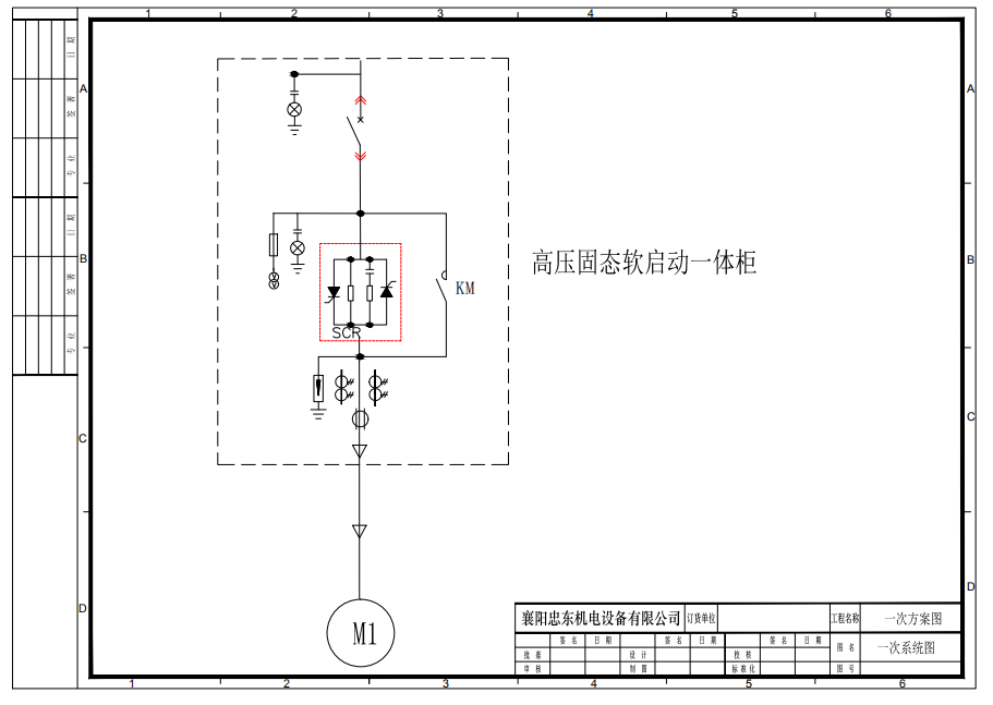 高壓固態(tài)軟起動(dòng)裝置設(shè)計(jì)為柜式結(jié)構(gòu)。柜體框架為50角鋼焊接而成,堅(jiān)固牢靠。柜體設(shè)計(jì)為柜底進(jìn)出線方式,在投入運(yùn)行前,只需要將高壓固態(tài)軟起動(dòng)裝置串聯(lián)接入高壓開(kāi)關(guān)柜和高壓電動(dòng)機(jī)之間即可。具體電氣一次方案圖見(jiàn)圖1.3。