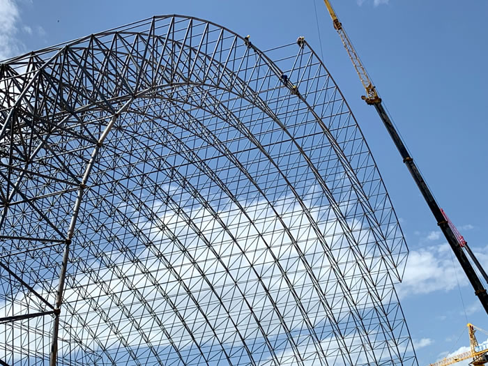 (4)本工程網(wǎng)架采用“山墻起步+錐體高空散裝法”進(jìn)行安裝,即先安裝1軸山墻網(wǎng)架(含相鄰跨網(wǎng)架)作為整個(gè)網(wǎng)架的起步網(wǎng)架,然后從起步網(wǎng)架開始依次往17軸方向?qū)W(wǎng)架進(jìn)行高空散裝,***安裝17軸山墻網(wǎng)架,最終安裝完成整個(gè)網(wǎng)架。